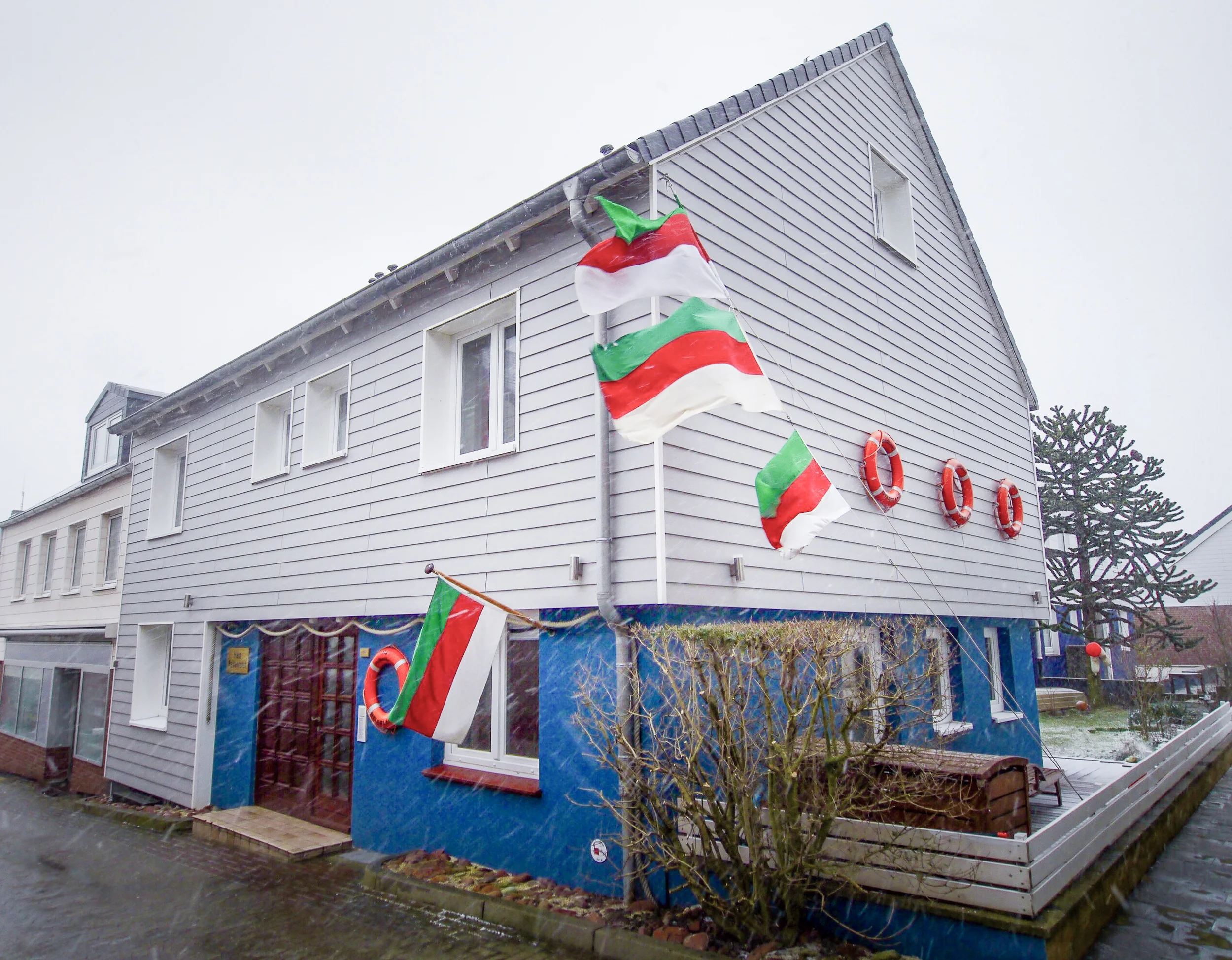 "Haus Falkenhorst" am 1.März 2016 prächtig mit Helgoländer Fahnen beflaggt zur Erinnerung an die Freigabe Helgolands im Jahr 1952.