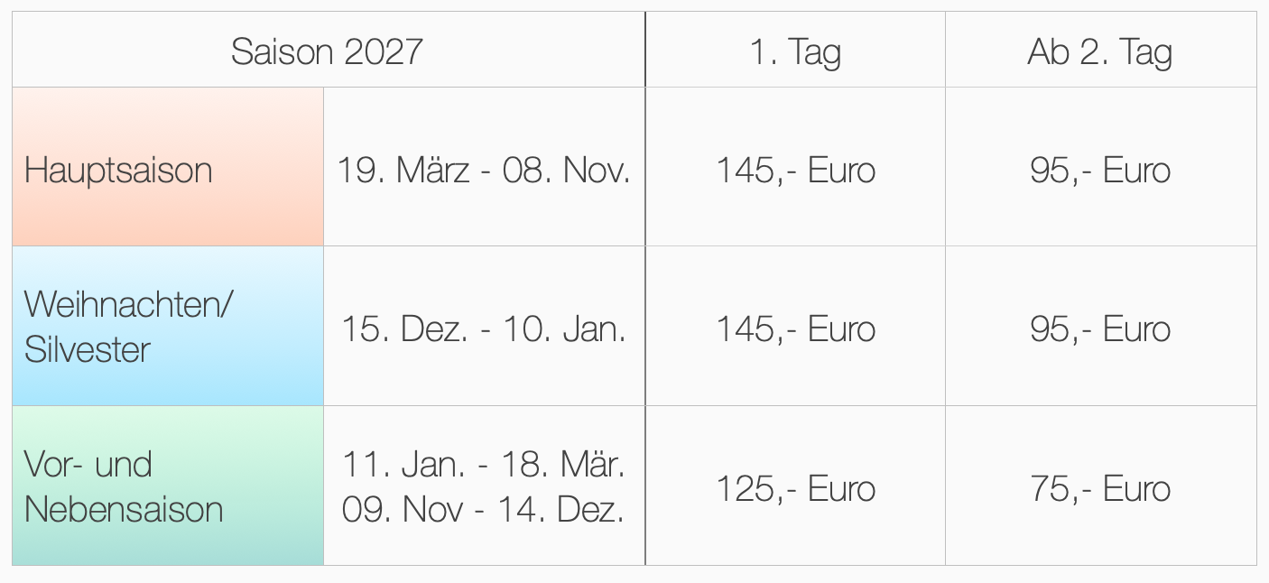 01.04. bis 31.10. – 2,75 Euro/Tag