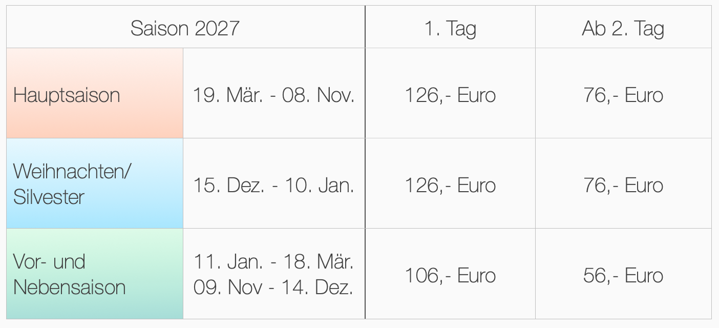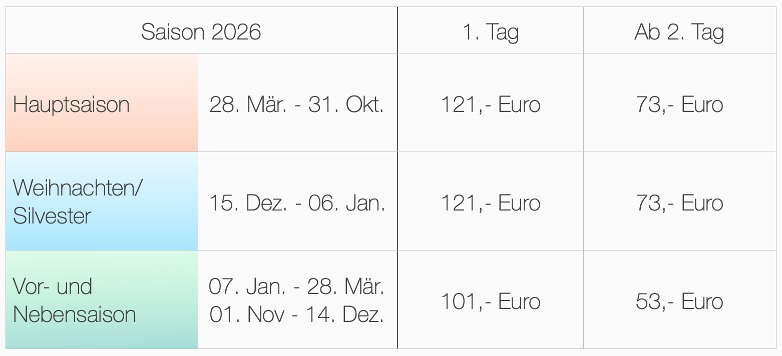 01.04. bis 31.10. – 2,75 Euro/Tag
